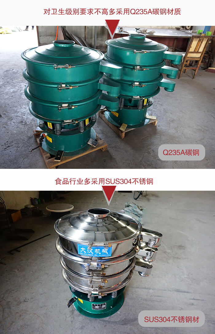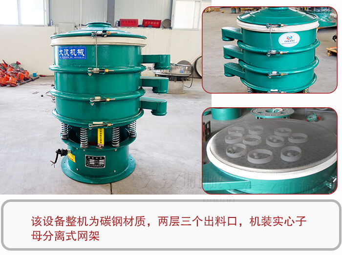 該設備整機為碳鋼材質,兩層三個出料口,機裝實心子母分離式網架,歸屬于常見的輕型振動篩分設備,也就三次元振動篩,碳鋼振動篩,本公司生產的DH系列振動篩可根據客戶不同需求1-5層同時使用,產品型號齊全,可滿足各種粉末、顆粒篩分需要求及液體過濾需求,也可設計為超聲波振動篩粉機、氣流振動篩粉機、振動篩粉機等機型。食品行業多多采用SUS304不銹鋼,對衛生級別要求不高多采用Q235A碳鋼作為主要材質。